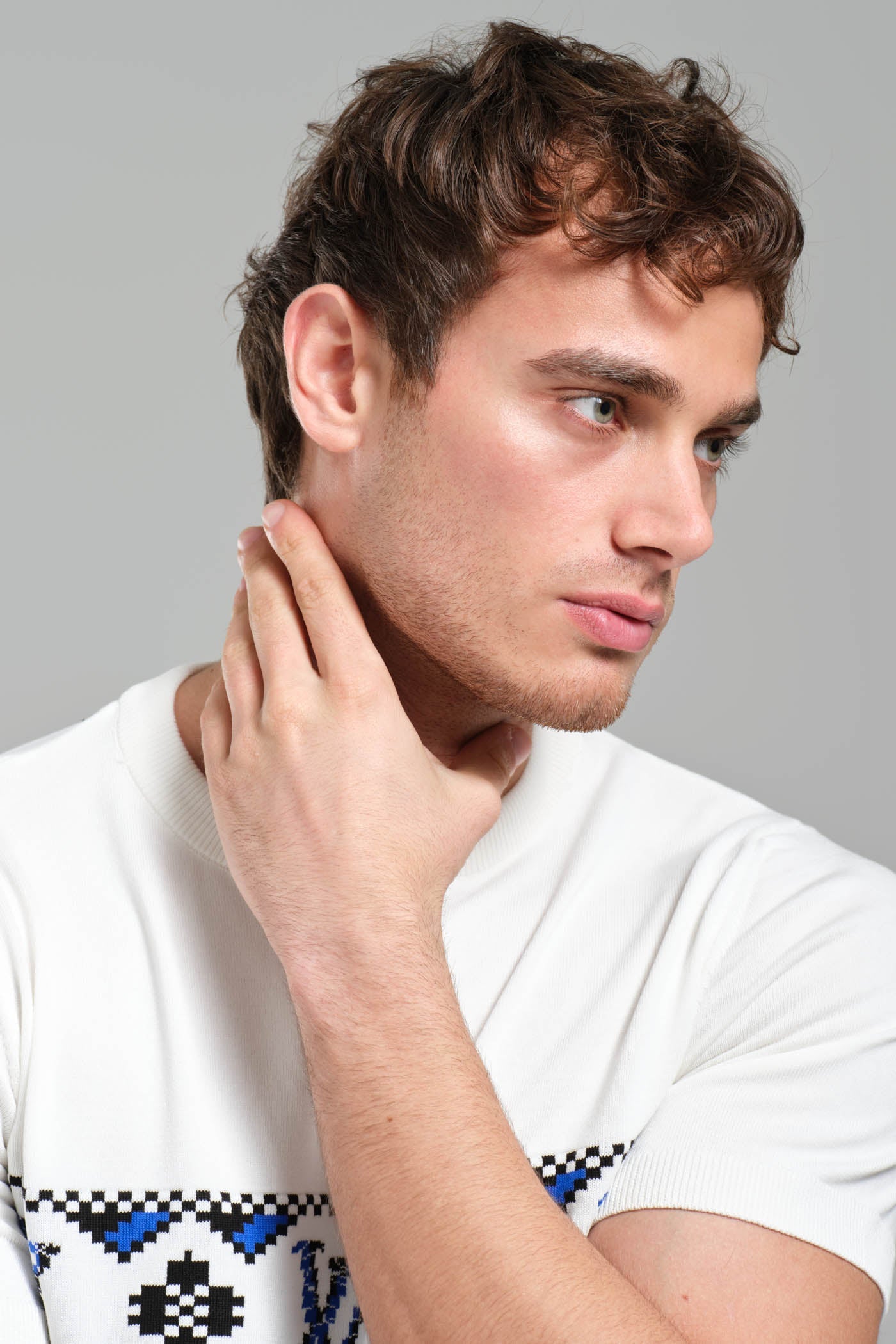 Add a touch of style to your wardrobe with this white knit t-shirt, featuring a bold, intricate patterned design across the chest. An item offering great value with minor imperfections.